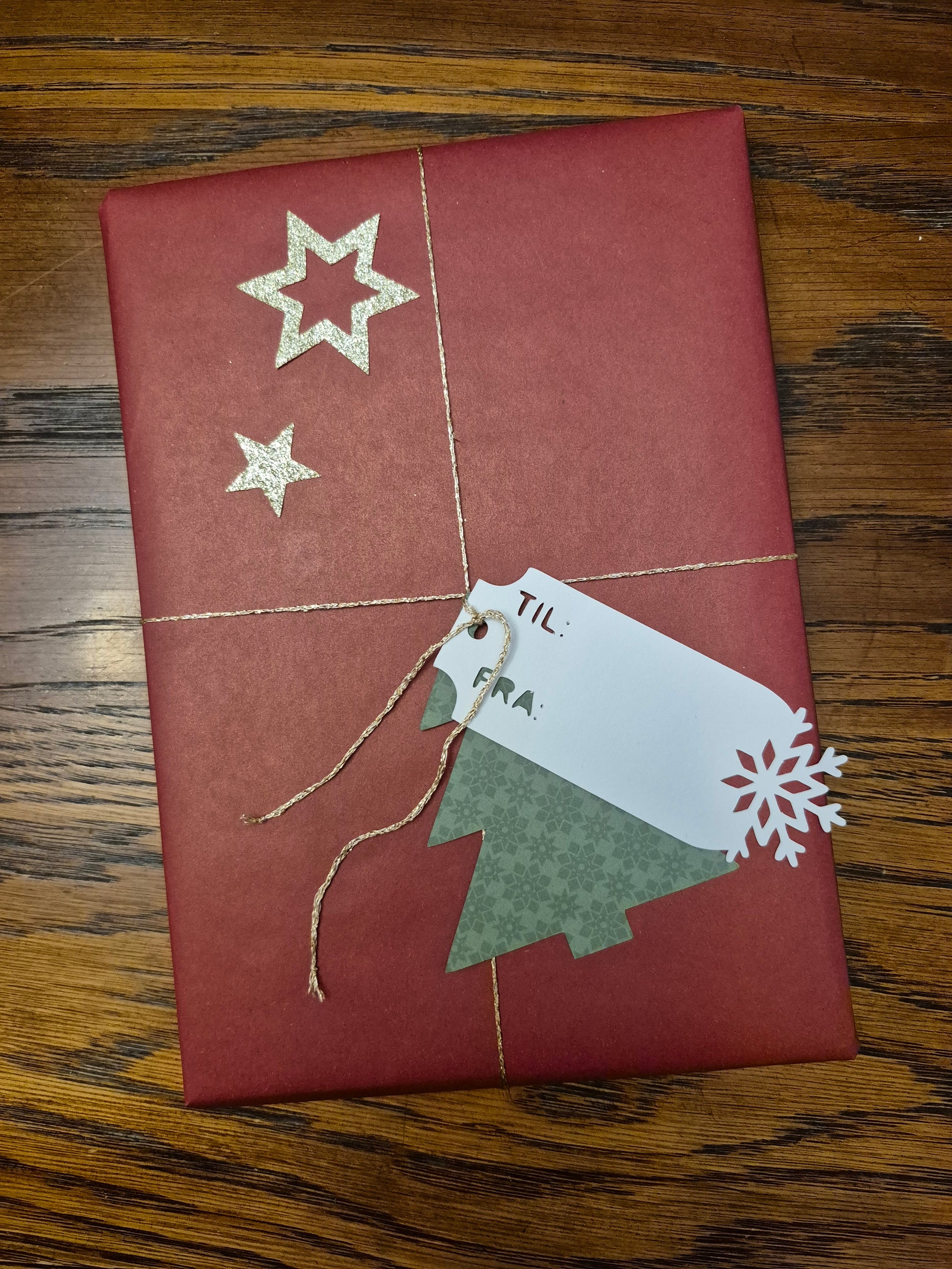 Fiks ferdig, klar til å legges under treet. Vakker gaveinnpakning i papir med glitterstjerner. Inkluderer bokmerke.
